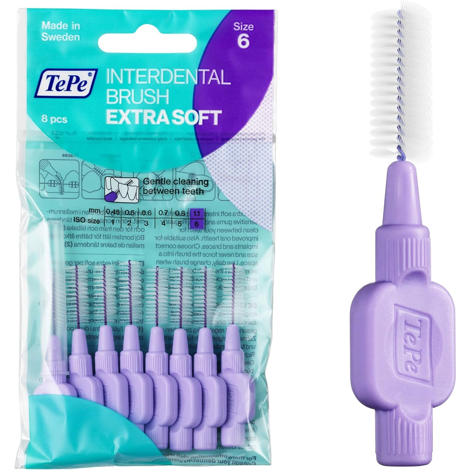 TEPE İnterdental Fırça Ekstra Yumuşak, Diş Temizliği için Süper Yumuşak Diş Fırçası, 8'li Paket, 1,1 mm, Büyük Boşluklar, Mor, Boyut 6